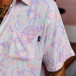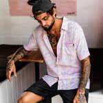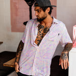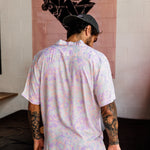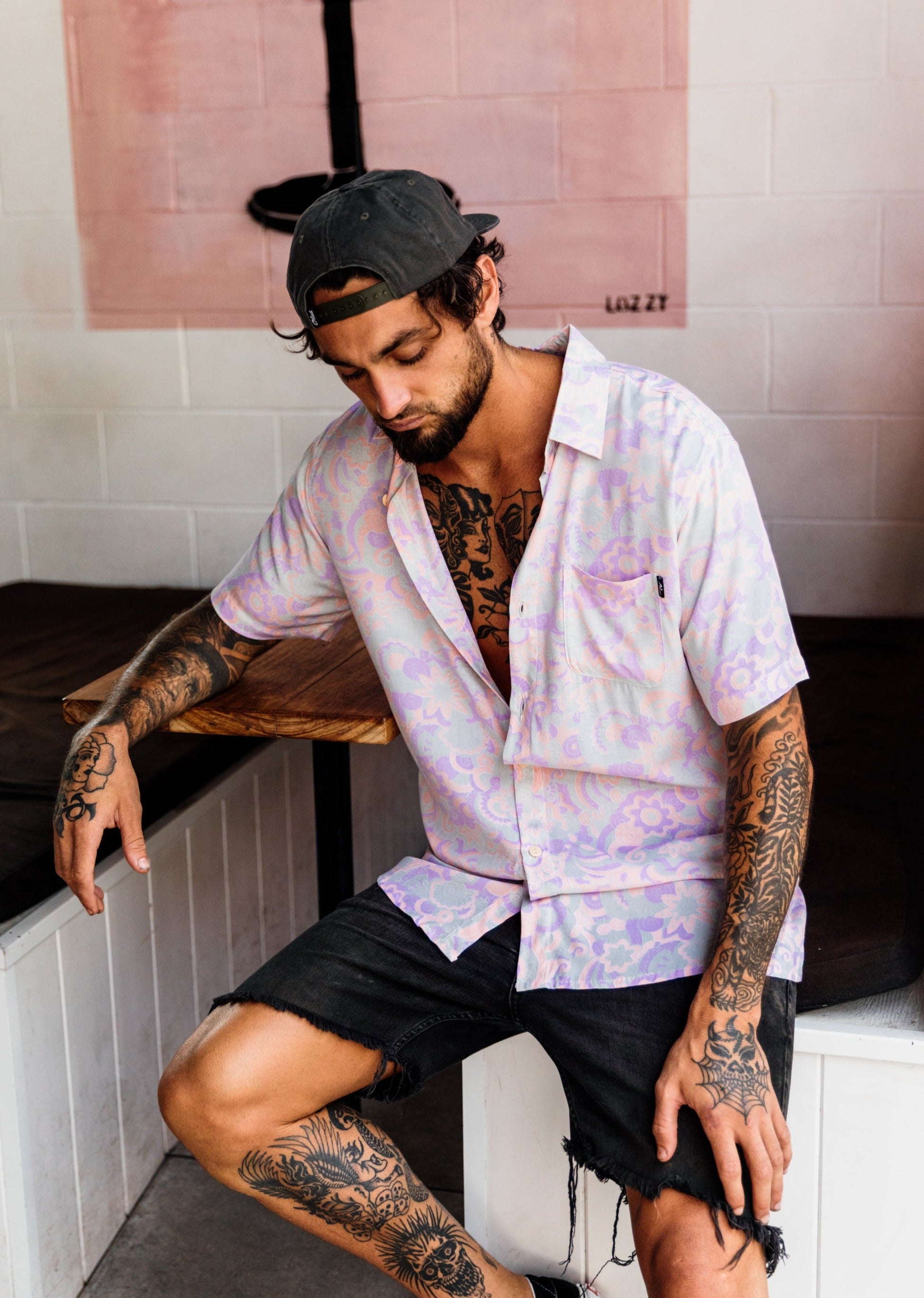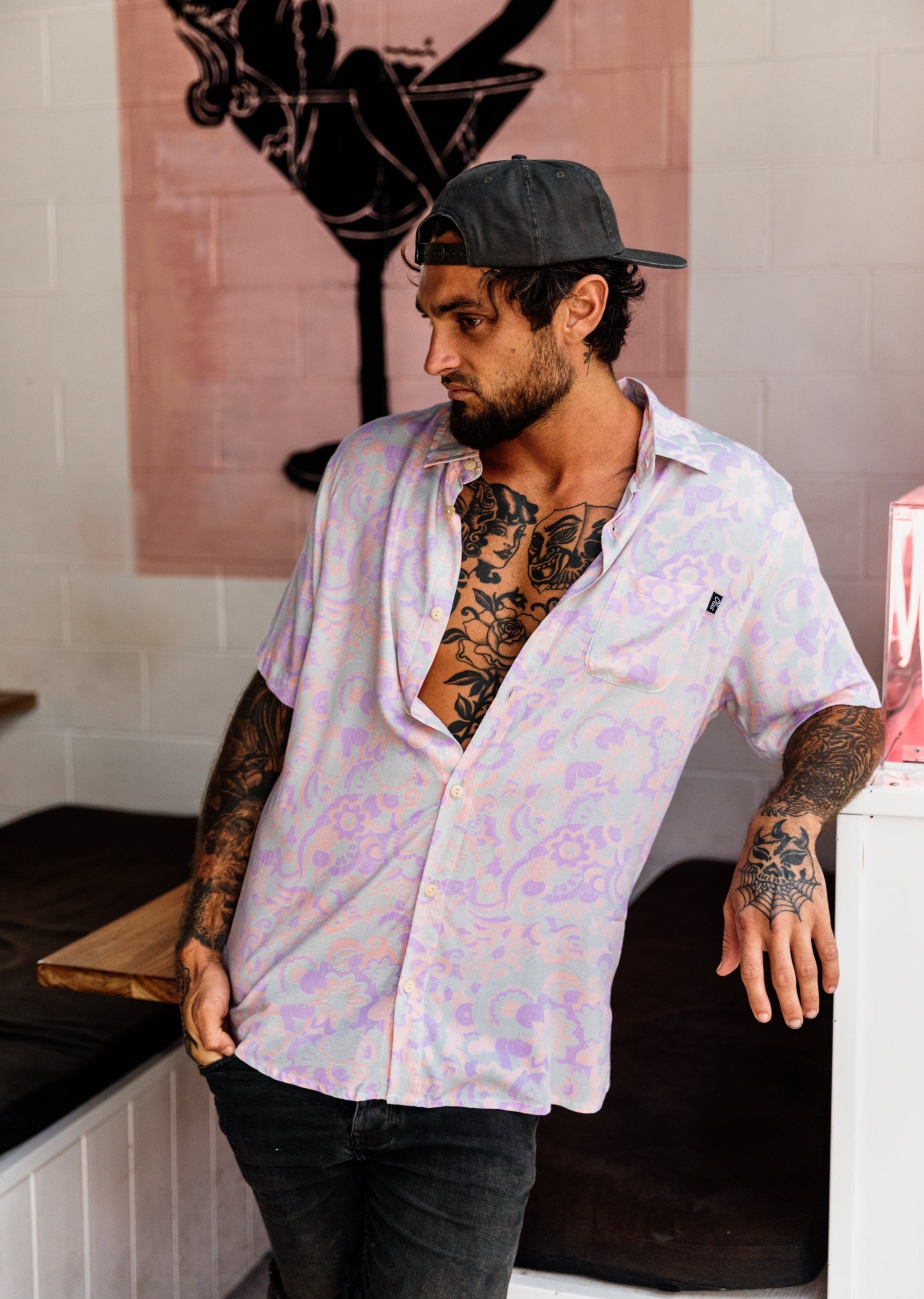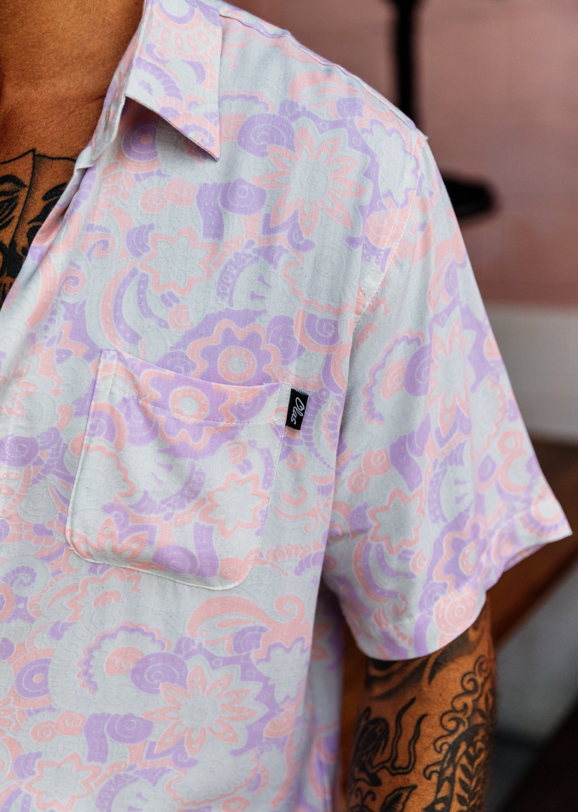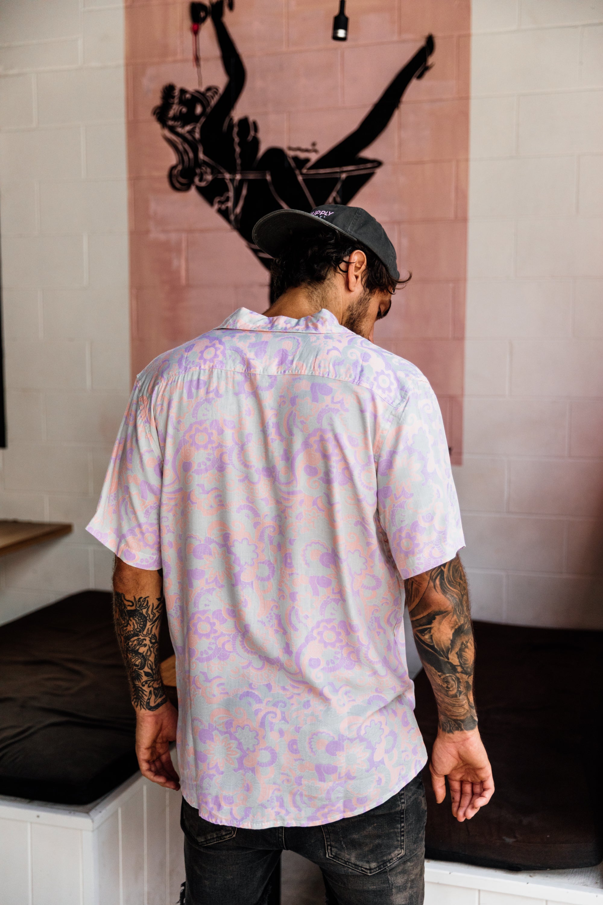 Make a statement but keep it subtle with this pastel number. With a one-of-a-kind pink and purple print on premium rayon material, this shirt is sure to stand out. Featuring a longer fit, timber buttons and a front left chest pocket, this shirt is perfect for any occasion.