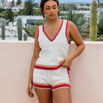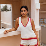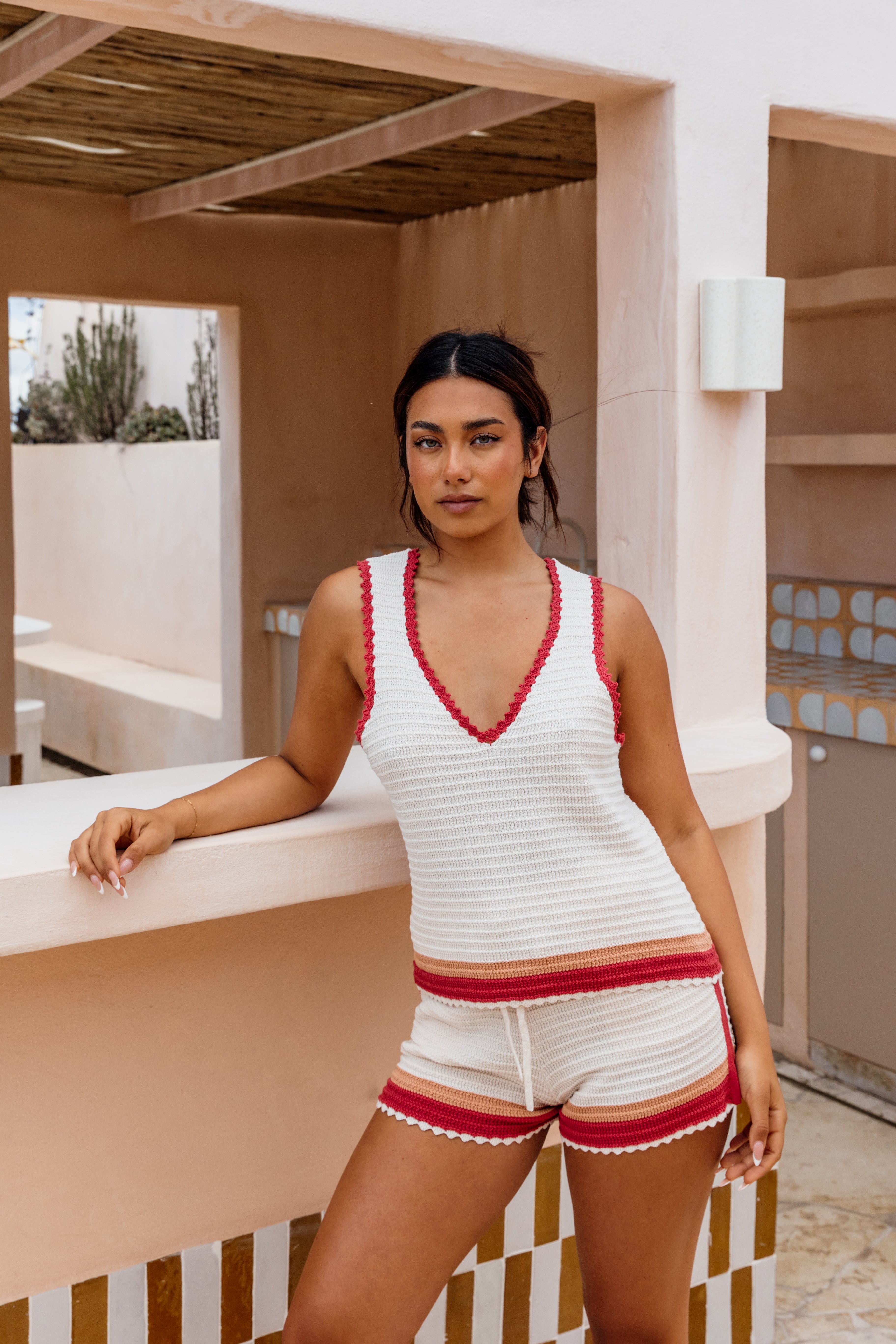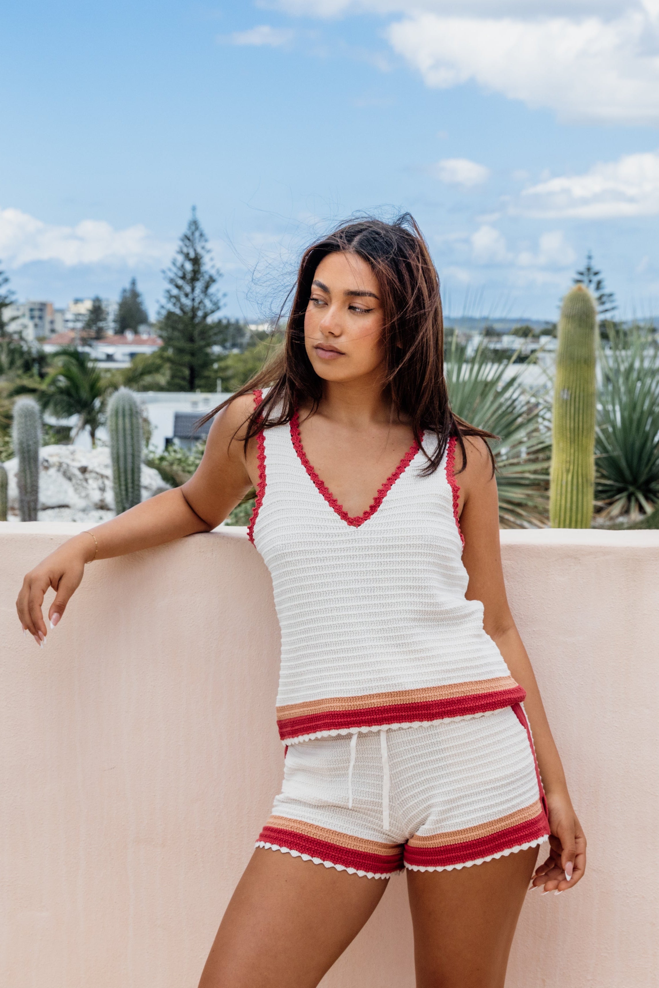 The Keepsake Top is a summer staple, finished with contrast stitching and a dreamy tie-up back for that laid-back, beach-to-bar feel. Light, textured, and full of charm, it pairs perfectly with the matching Keepsake Short for an effortless set.
