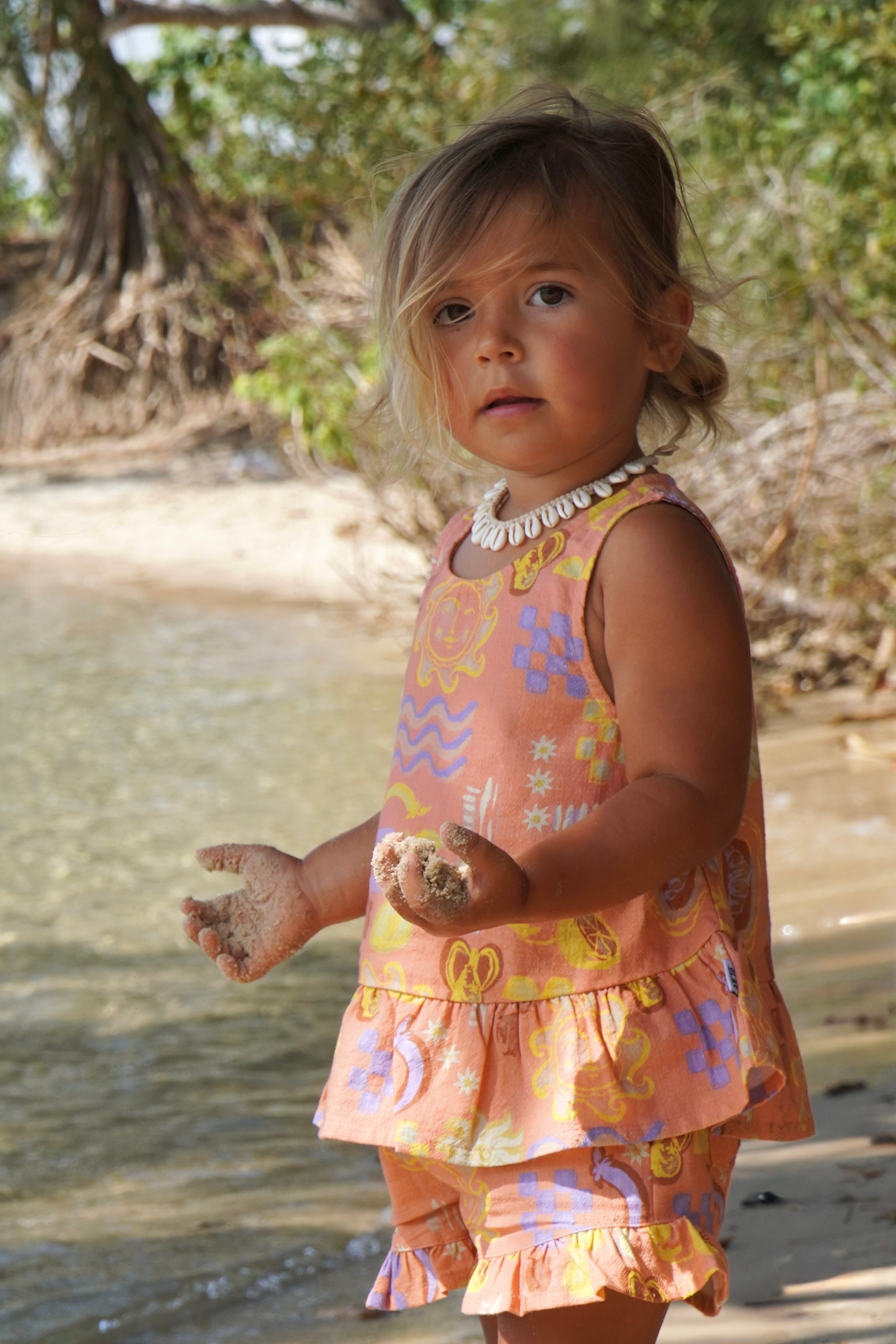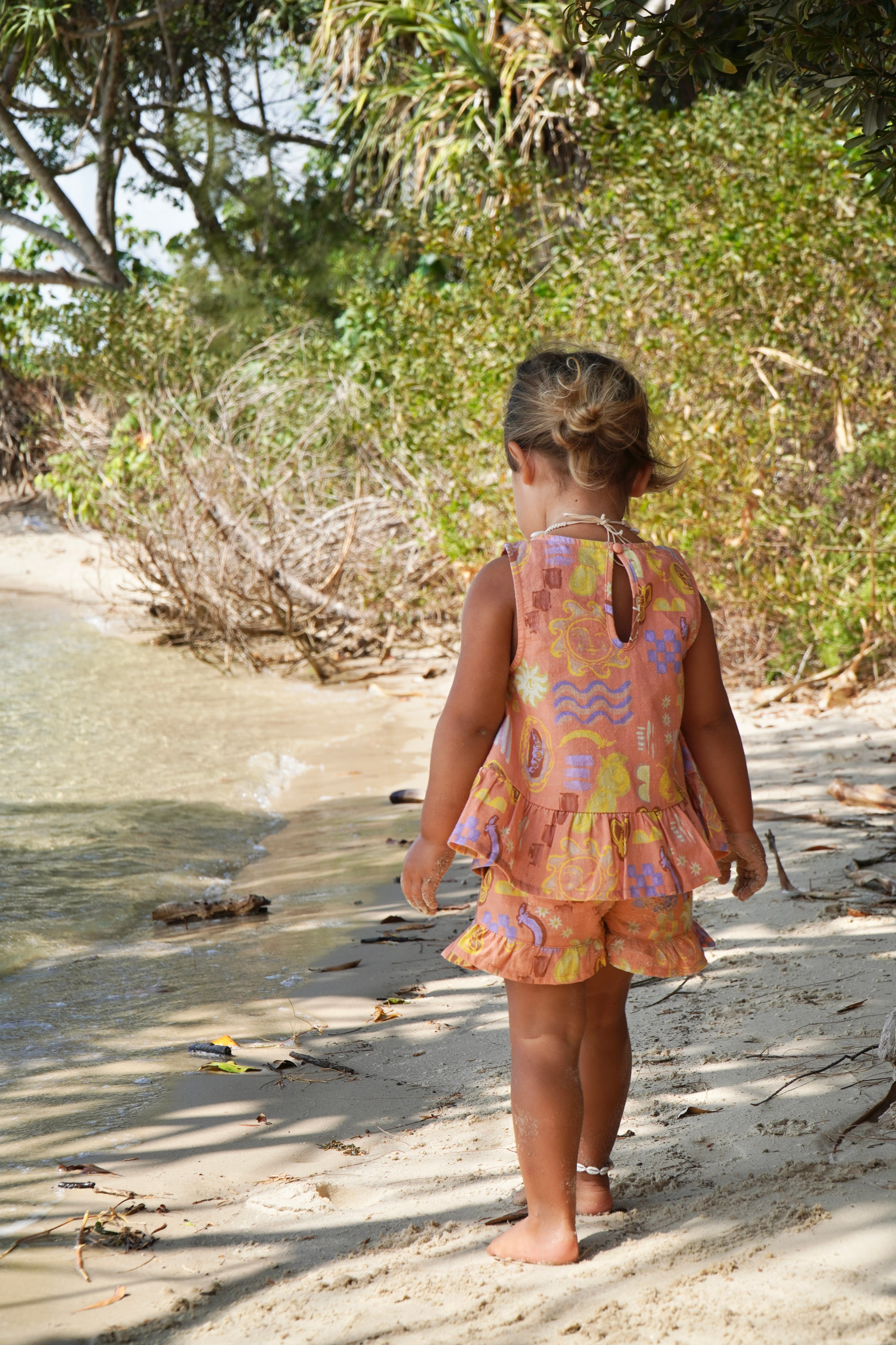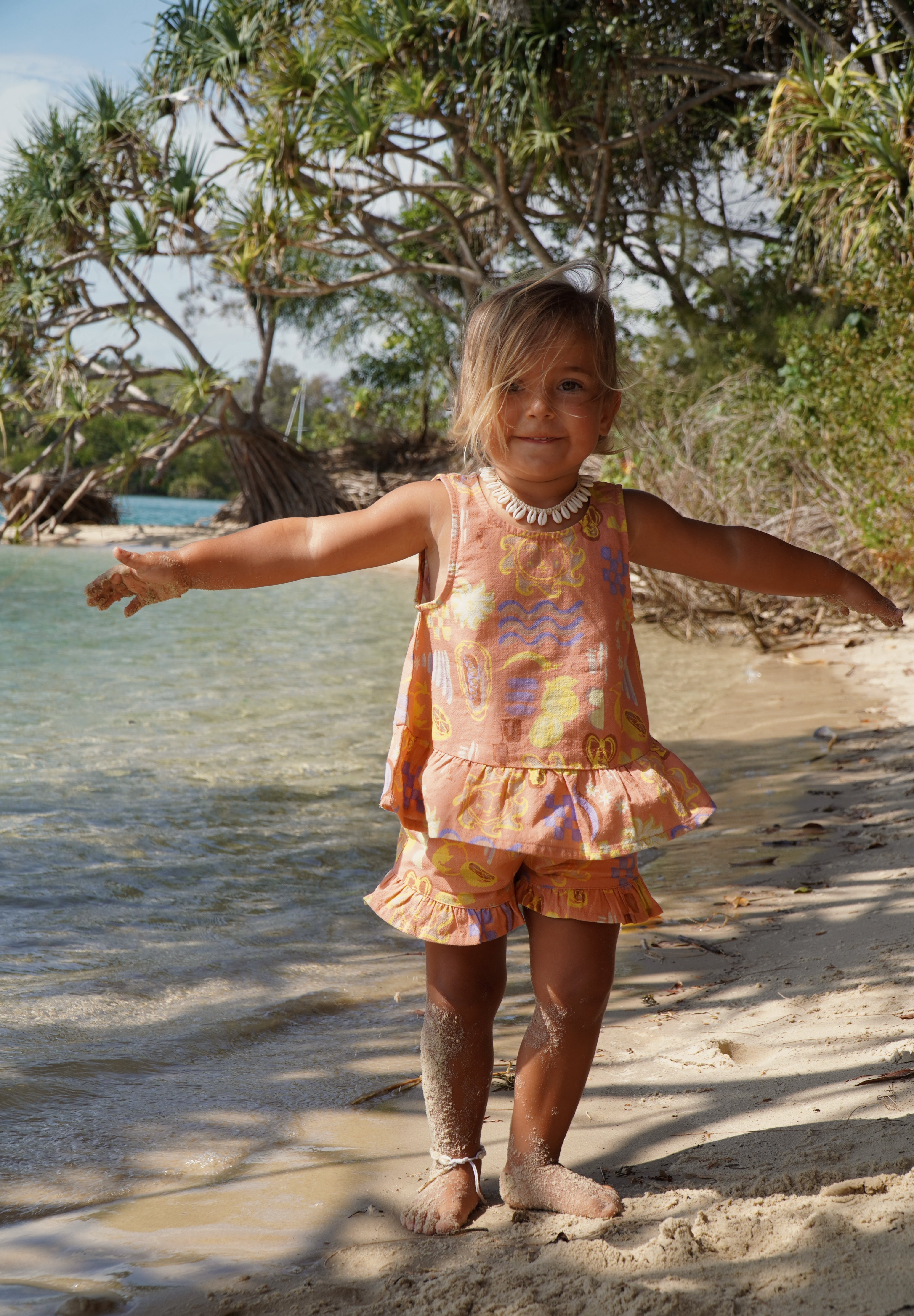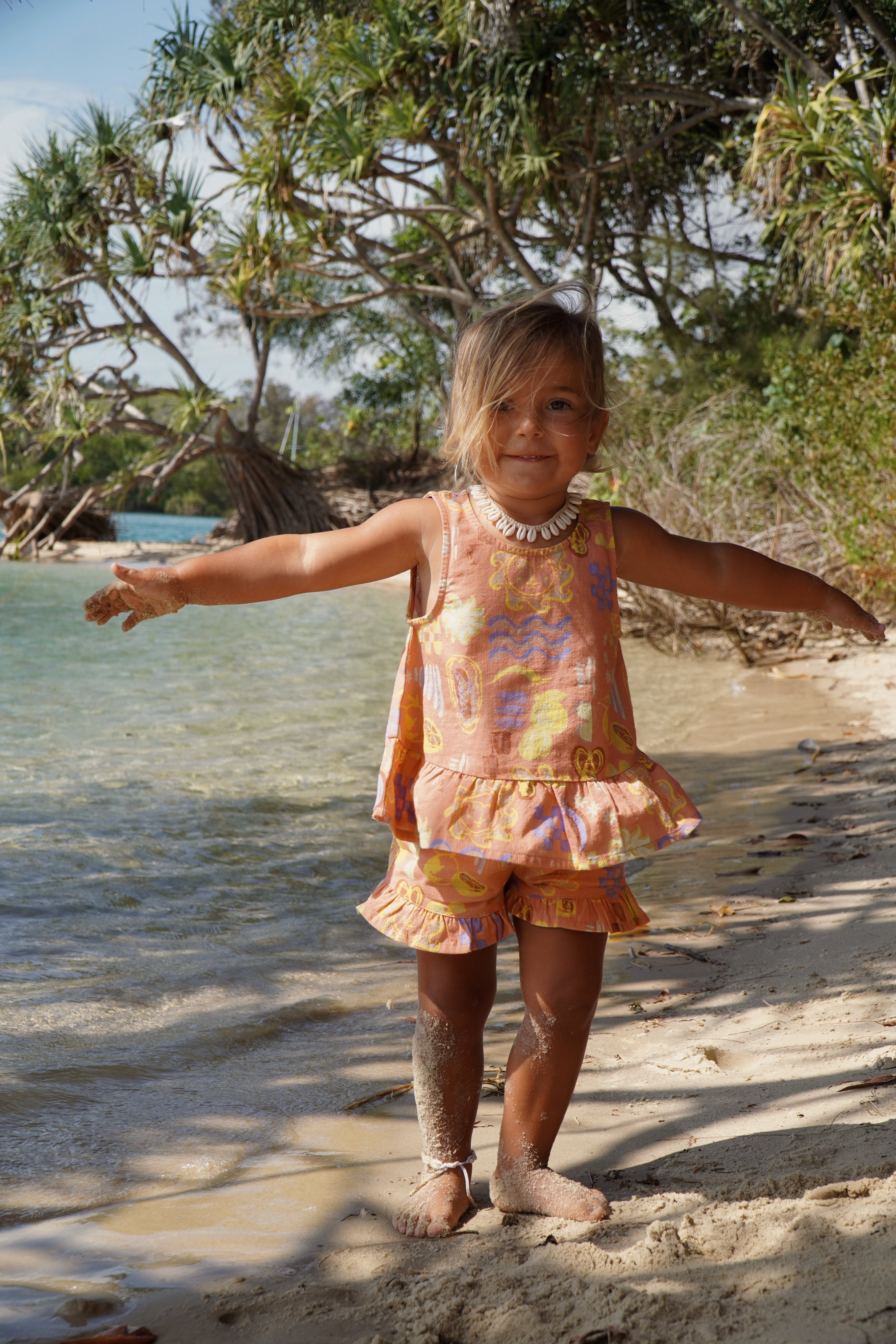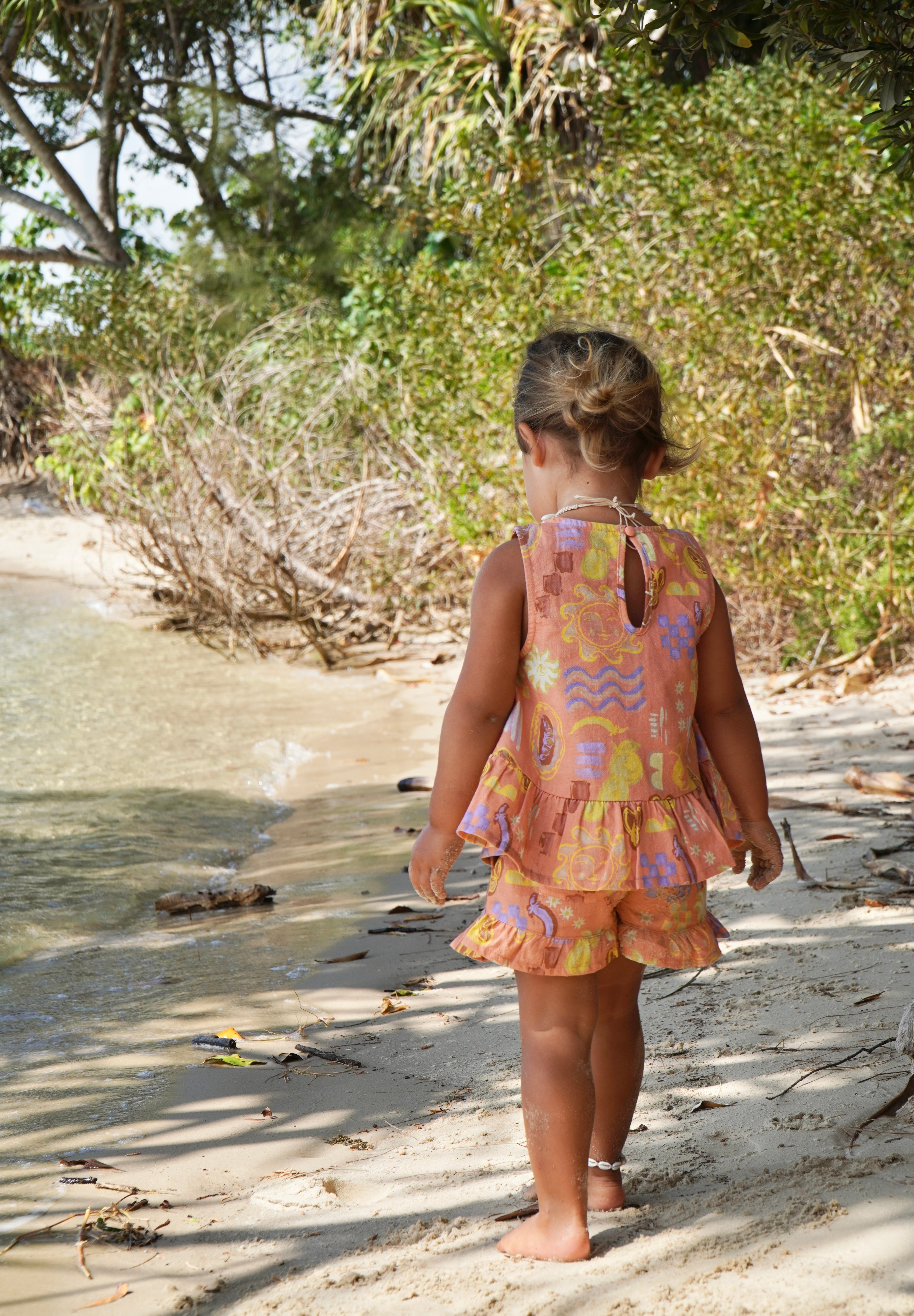 The Sundrenched Mini Top is a summer essential for little adventurers. With its lightweight feel and sun-soaked colours, it’s made for days spent running wild and laughing under blue skies. Pair it with the Sundrenched Mini Shorts for the full set.